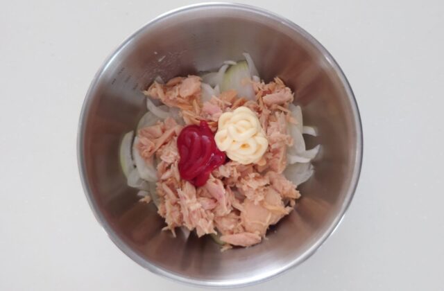 - ボウルにオリーブフレーク、①、ケチャップとマヨネーズを入れて混ぜる。